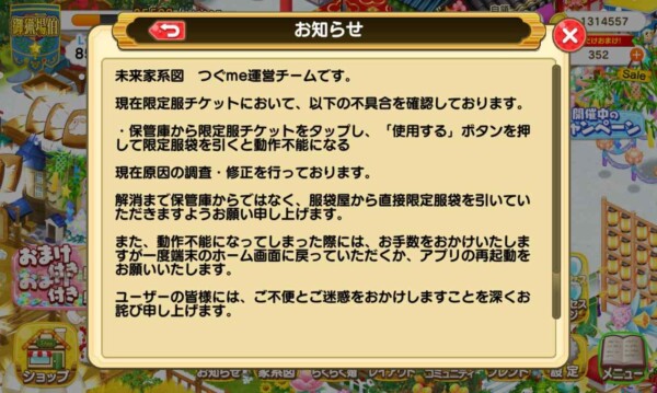 未来家系図 つぐme運営チームより、限定服チケットに関する不具合についてのお知らせがありました。