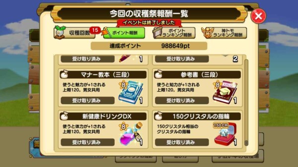 収穫祭を頑張った結果、150クリスタルの指輪まで獲得することができました。