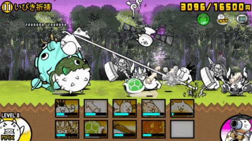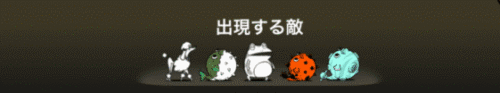 このステージでは、「フグ太くん」「テッポー」「超新星テッサー」という転がって攻めてくる3種類の敵に加え、超遠方から長時間の鈍足攻撃を仕掛けてくる「ケロ助」が登場します。転がりながら強烈な攻撃を仕掛けてくる3種の敵よりも、「ケロ助」の鈍足攻撃のほうが厄介でした。そのため、動きを遅くする妨害を無効化できるキャラを多めに編成しました。