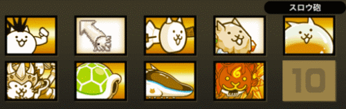 「スピードアップ」、「ネコボン」、「ニャンピューター」。「スピードアップ」の使用はお好みで使って下さい。にゃんこ砲はスロウ砲。装飾は攻撃力ダウンの妨害軽減、土台は古代の敵から受けるダメージ軽減です。