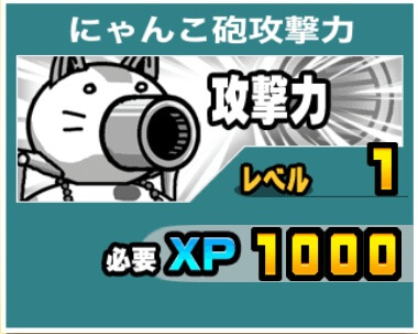 | にゃんこ砲攻撃力 | にゃんこ砲の攻撃力がアップ。但し、にゃんこ砲のチャージ時間が少し伸びる。 | ![]() | D |