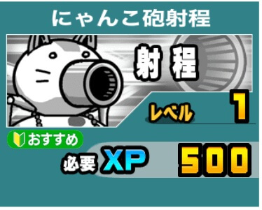 | にゃんこ砲射程 | にゃんこ砲の射程が伸びる。ステージが広いときに有利。 | ![]() | B |