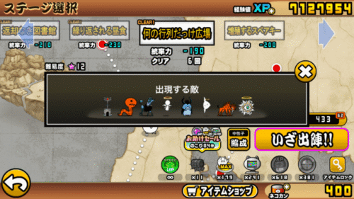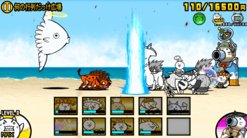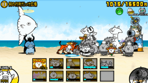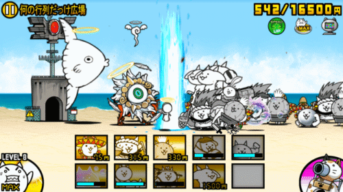 このステージでは、敵城が「烈波」を撃ってくるタイプの城になっています。厄介な敵として「マンボーグ鈴木」と「レッド・エナG」が登場しますが、なかでも一番手強いのは「ミニエンジェルサイクロン」です。登場するとすごい勢いでこちらの味方をなぎ倒してきますが、ノックバックはしやすい相手でもあります。