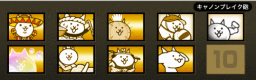 「スピードアップ」、「ネコボン」、「ニャンピューター」。「スピードアップ」の使用はお好みで使って下さい。にゃんこ砲はキャノンブレイク砲。装飾は烈波ダメージ軽減、土台は赤い敵から受けるダメージ軽減です。