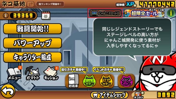 これだけ大量のネコカンゲットは難しいので、遊ぶ時間が取れなくてもスロットだけは回しておくのをお勧めします。下の画像の赤枠内、ネコ基地上部にスロットへの入り口が有ります。