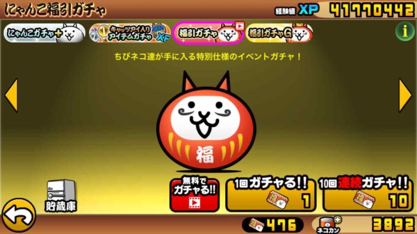福引ガチャはちびネコ達が手に入るガチャのチケットです。ちびネコ達はちびでもあちこちで活躍出来るキャラです。見た目弱そうですが、基本キャラより便利に使える場面があるので、獲得して強くしておきましょう。