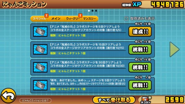 • コラボステージ 5回クリア・・・・にゃんこチケット1個
