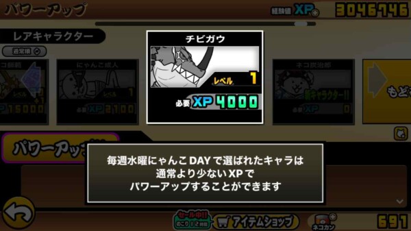 XP不足で育成が止まりがちな初心者さんには特にありがたいですね。プレイヤーさんごとに違うのかわかりませんでしたが、私の今週の対象キャラはチビガウでした。XPの文字が水色になってます。