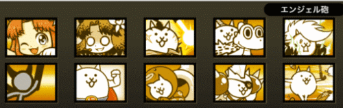「スピードアップ」、「ネコボン」、「ニャンピュータ」。「スピードアップ」の使用はお好みで使って下さい。にゃんこ砲はエンジェル砲。波動攻撃のダメージ軽減、土台は黒い敵から受けるダメージ軽減。