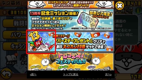 「にゃんこ大戦争13周年イベント第3弾!」 を開く - お祝いステージ案内の中から