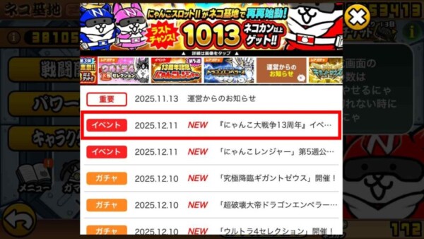 ②イベント2025.12.11【にゃんこ大戦争13周年】イベントのお知らせをタップ