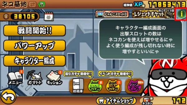 ①まずは、ネコ基地へ。画面右上のiのマークをタップ。下の画像だと赤枠で囲んだあたり。