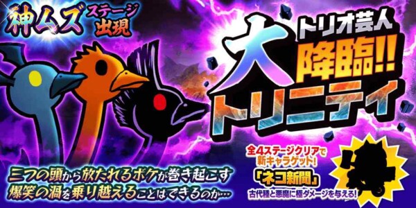 新ステージ「トリニティ大降臨」が登場しました。全4ステージ構成で、最終ステージをクリアすると新キャラ「ネコ新聞」を入手できます。