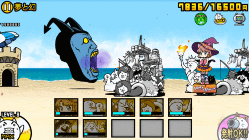ステージ開始後、「ニャンピューター」を切って、城から出てくる「ウルトラメェメェ」に「ネコスーパーカー」を当てて倒します。